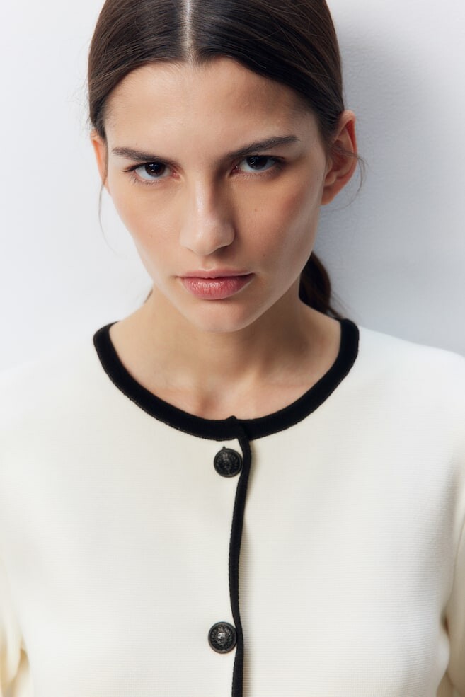 Приталенный кардиган из плотной вязки с контрастными краями. Круглый вырез, пуговицы спереди и клапаны карманов на пуговицах.