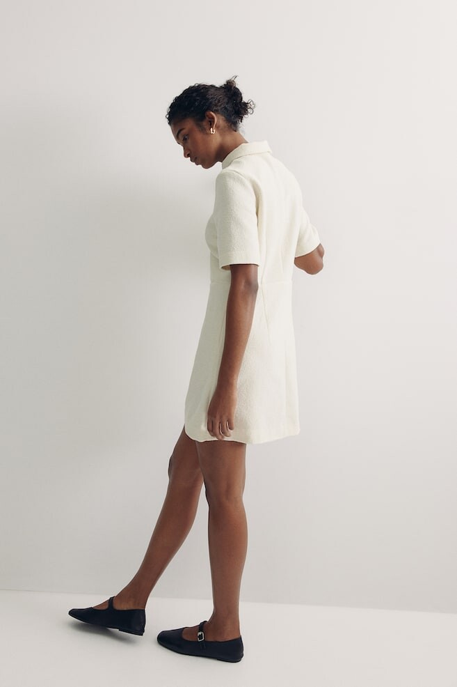 Короткое платье из букле с добавлением шерсти. Воротник, планка на пуговицах, короткие рукава и потайная молния сбоку. Слегка расклешенная юбка. На подкладке.