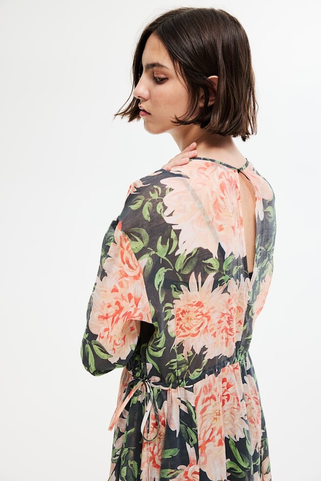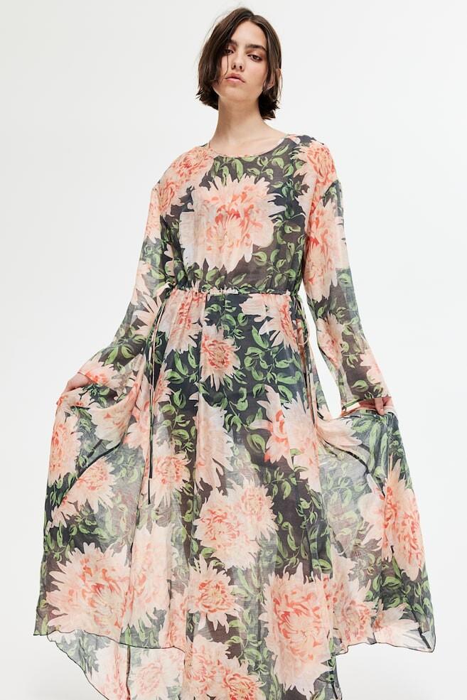 Платье длиной до щиколотки из прозрачной лиоцелловой смеси. Свободный крой с круглым вырезом и разрезом на горловине с потайной застежкой на пуговицу. Заниженная линия плеч, длинные рукава и узкие завязки на талии с длинными завязками по бокам. Асимметричный подол с оверлочной обработкой. Без подкладки.