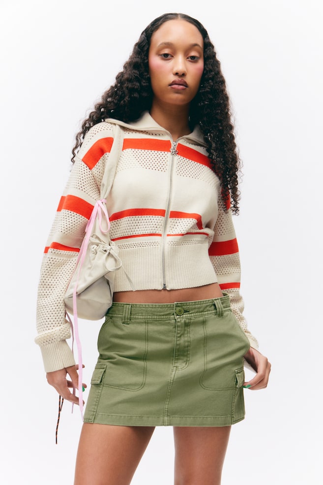 Мини-юбка карго из прочного хлопкового полотна в практичном стиле. Модель имеет заниженную талию, наклонные боковые карманы, накладные карманы с клапанами и характерную декоративную строчку, придающую ей структурированный вид. Дизайн дополняют молния и шлевки для ремня. Обычная посадка. мини-длина. Заниженная талия. Косые карманы. накладные карманы. Молния. Шлевки для ремня.