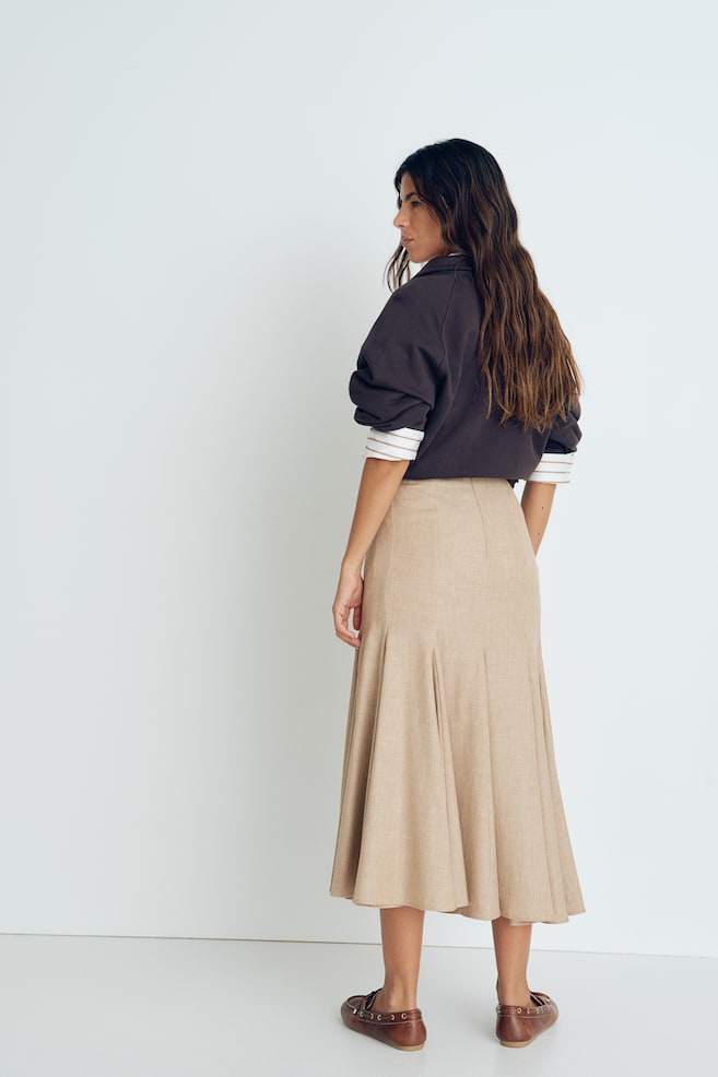 Юбка длиной до икры с потайной молнией сбоку и складками годе для расклешенного силуэта от колена.