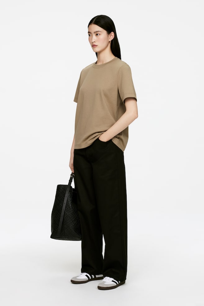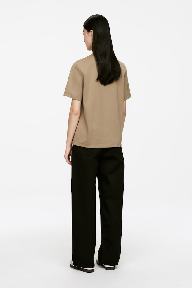 Футболка из плотного трикотажа интерлок. Прочный, но мягкий материал хорошо держит форму и выглядит элегантно. Модель с коротким рукавом, круглым вырезом и классическим кроем.