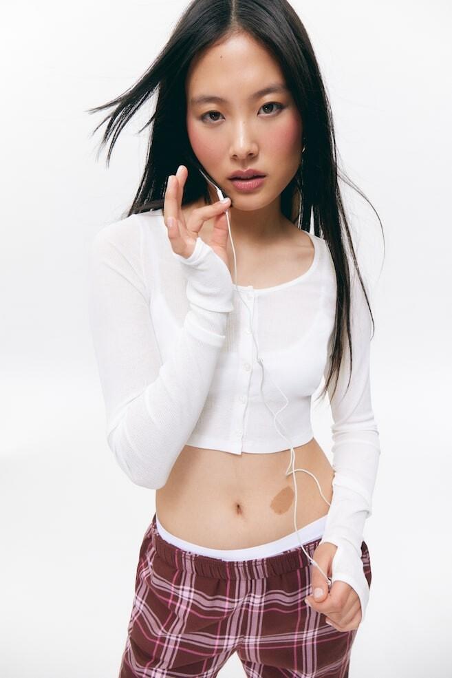 Изящный ребристый кардиган с длинными рукавами и укороченным кроем. Имеет широкий круглый вырез, застежку на пуговицы и отверстия для больших пальцев. Облегающий крой. Подстригитесь короче. круглый вырез горловины. застежка на пуговицы. отверстия для больших пальцев. Ткань в рубчик.