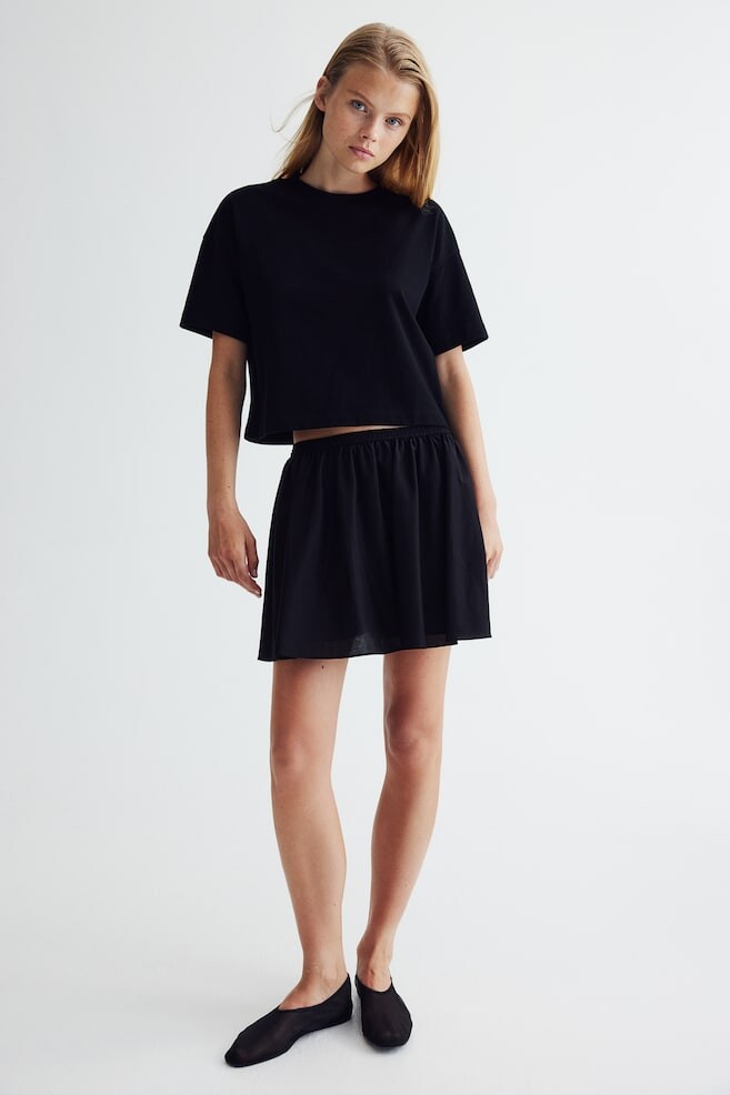 Короткая юбка-шорты А-силуэта из нежной ткани с эластичным поясом.