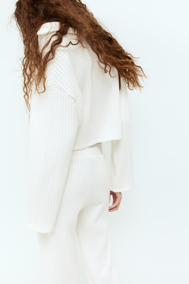 Облегающие брюки из мягкого трикотажа с эффектом косичной вязки. Высокий эластичный пояс и расклешенные штанины.
