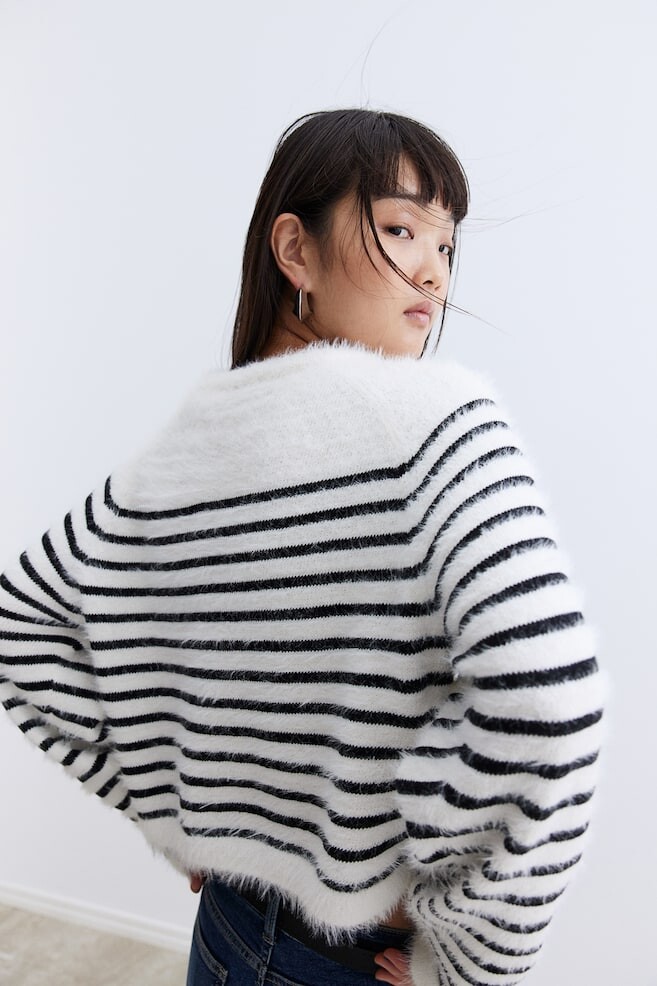 Свитер реглан из мягкой, пушистой вязки с ребристым круглым вырезом и ребристыми манжетами на рукавах и подоле.