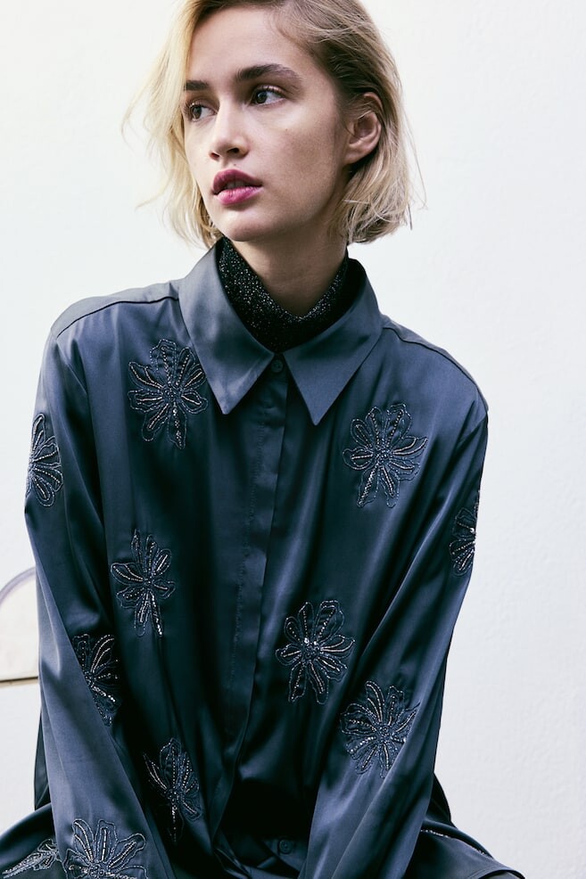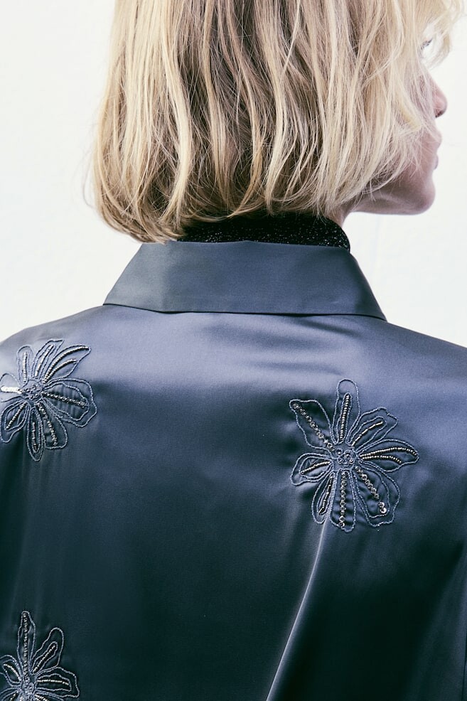 Блузка из тонкой блестящей ткани с вышитым цветочным узором из жемчуга и пайеток. Повседневный крой. С воротником, потайной планкой на пуговицах и манжетами на пуговицах.