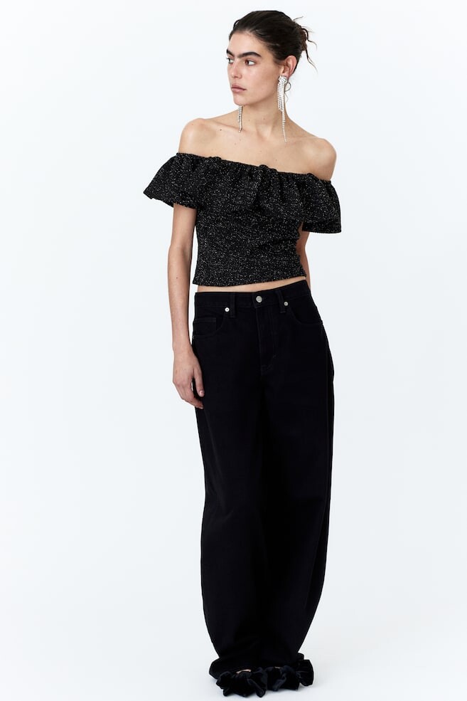 Приталенный топ с открытыми плечами из структурированного трикотажа с блестящей пряжей. Широкая оборка сверху.