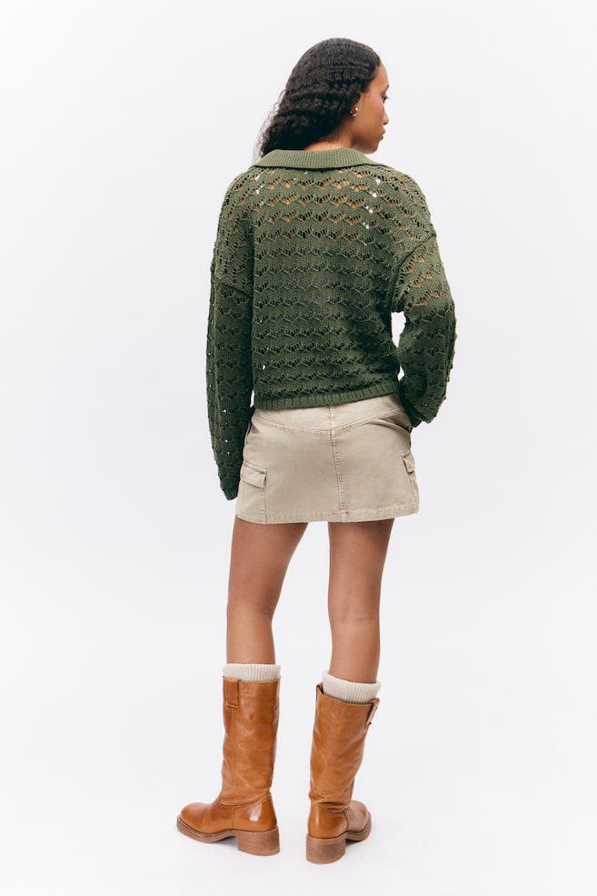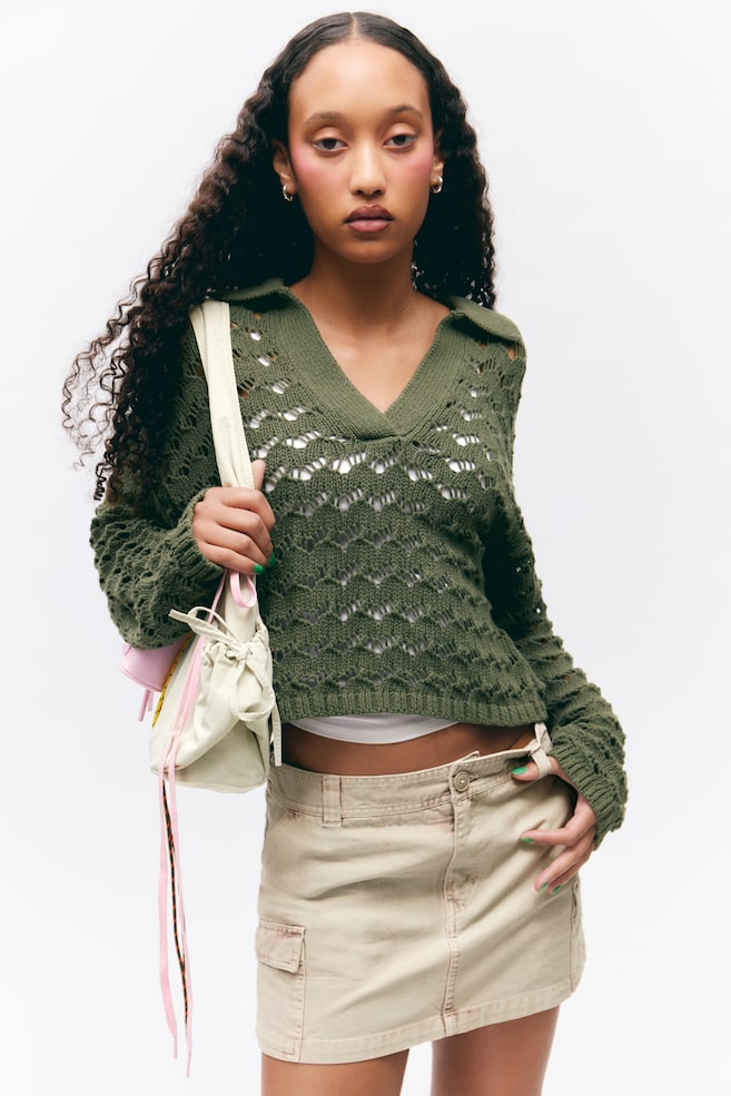 Свитер свободной вязки из мягкой хлопковой пряжи. Имеет ребристый отложной воротник и ребристые манжеты. Свободный крой. Нормальная длина. Отложной воротник. V-образный вырез. Ребристые манжеты. Свободная вязка.