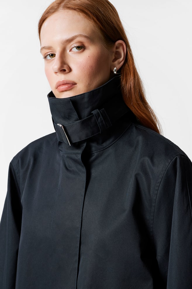 Пиджак А-силуэта с высоким воротником и поясом с пряжкой, двумя косыми прорезными карманами и разрезом сзади. • Свободный крой • Потайные пуговицы Длина куртки: 76,5 см (размер S)