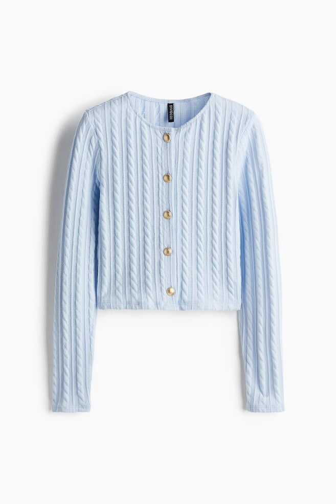 Кардиган из мягкого трикотажа с узором «косы». Круглый вырез, золотистые пуговицы и длинные рукава.
