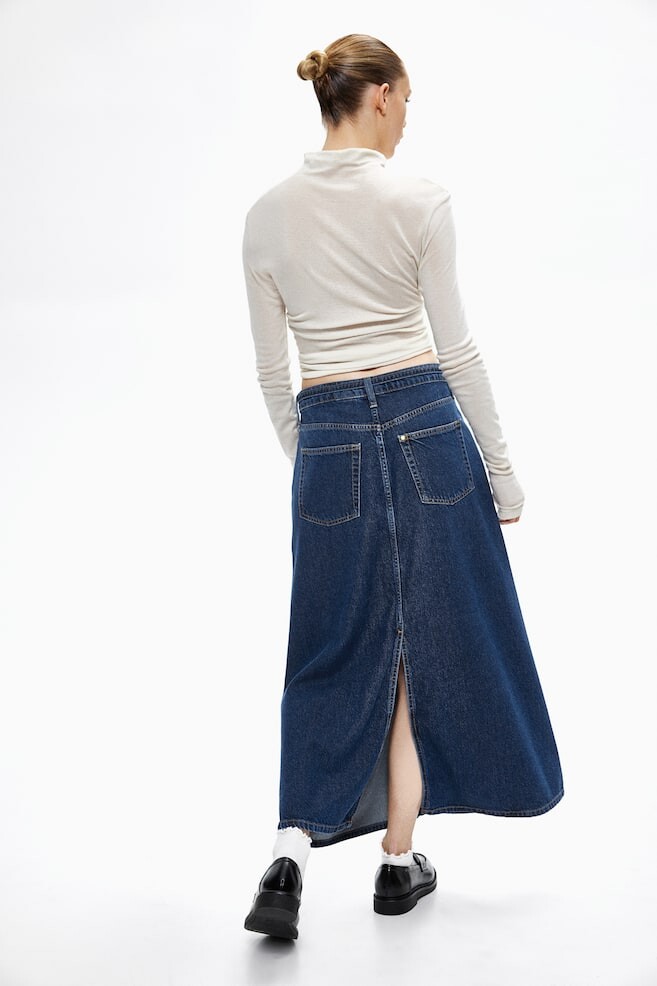 Длинная юбка с пятью карманами из очень мягкого и легкого денима. Высокая талия с застежкой на молнию и пуговицу, а также высокий разрез на подоле.