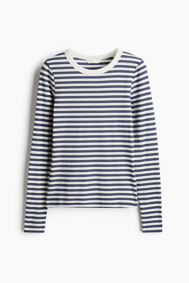 Облегающая рубашка из хлопкового трикотажа в рубчик. Рубашка имеет круглый вырез горловины с узкой вставкой, длинные рукава и прямой подол.