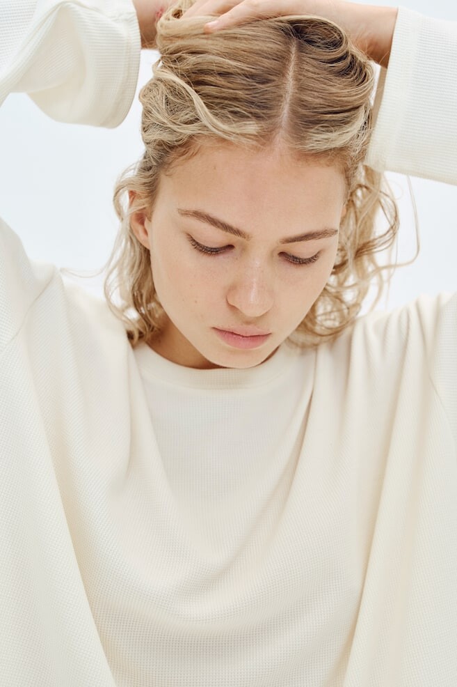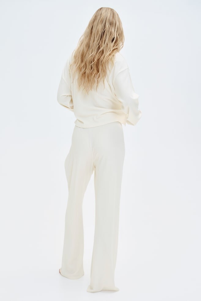 Пижама из вафельного джерси. Рубашка с длинными рукавами, круглым вырезом и спущенными плечами. Подходящие брюки с эластичной талией на шнурке и прямыми штанинами.