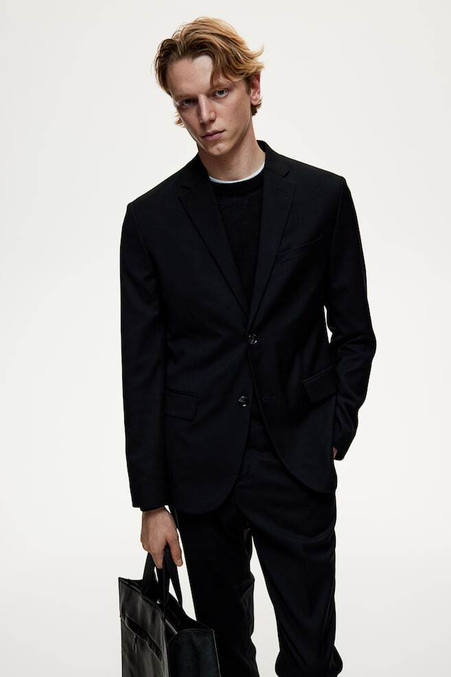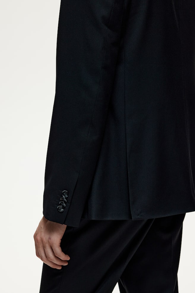 Однобортный пиджак из мягкой тканой ткани. С узким зубчатым лацканом, декоративной петлей и двумя пуговицами спереди. Прорезной карман на груди, два кармана с клапанами и два внутренних кармана. Декоративные пуговицы на рукавах и двойной разрез сзади. Slim Fit — это покрой, который адаптируется к контурам тела и создает стройный силуэт. На подкладке.