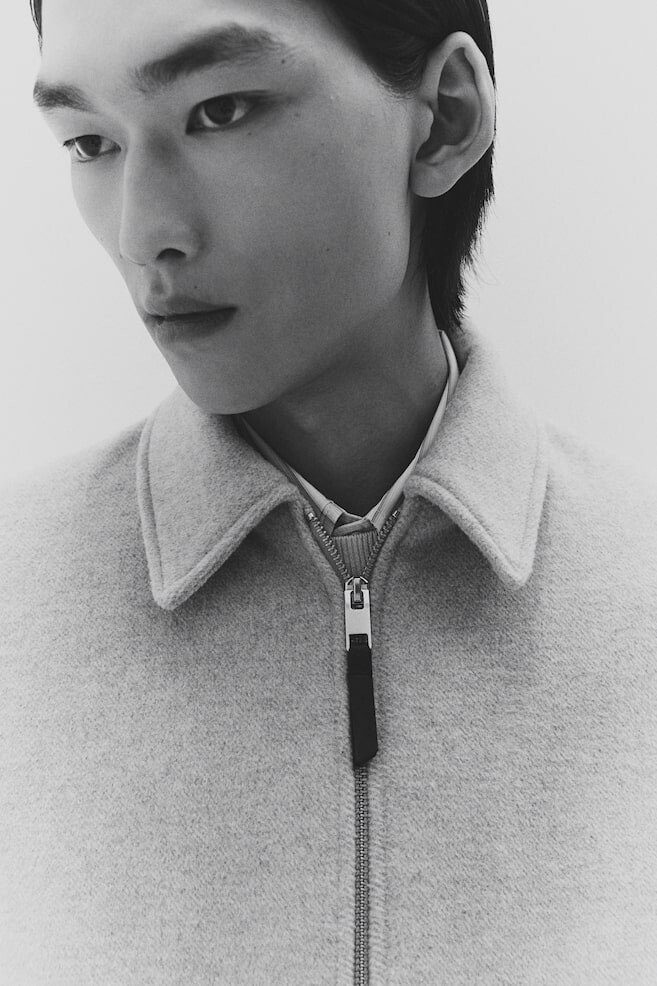 Куртка из фетровой шерстяной смеси с воротником, молнией спереди и видимыми швами сзади. Косые прорезные карманы с потайной застежкой на кнопку и внутренний карман с застежкой на кнопку. Прямой подол. Федерал. Обычная посадка для комфортного ношения и классического силуэта.