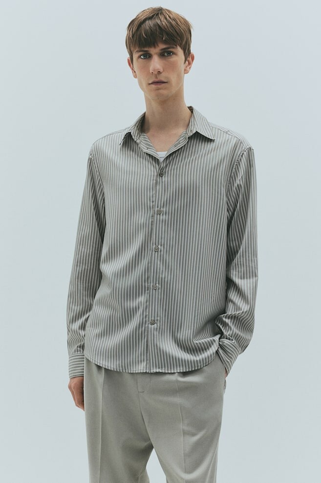 Рубашка из мягкой тканой ткани с отложным воротником, французской застежкой на пуговицы, кокеткой со складкой сзади и длинными рукавами с манжетами на пуговицах. Слегка закругленный подол. Обычная посадка для комфортного ношения и классического силуэта.