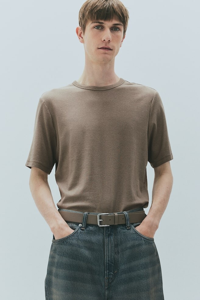 Футболка из рубчатого трикотажа средней плотности с круглым вырезом и прямым подолом. Slim Fit — это посадка, которая адаптируется к контурам тела и создает стройный силуэт.