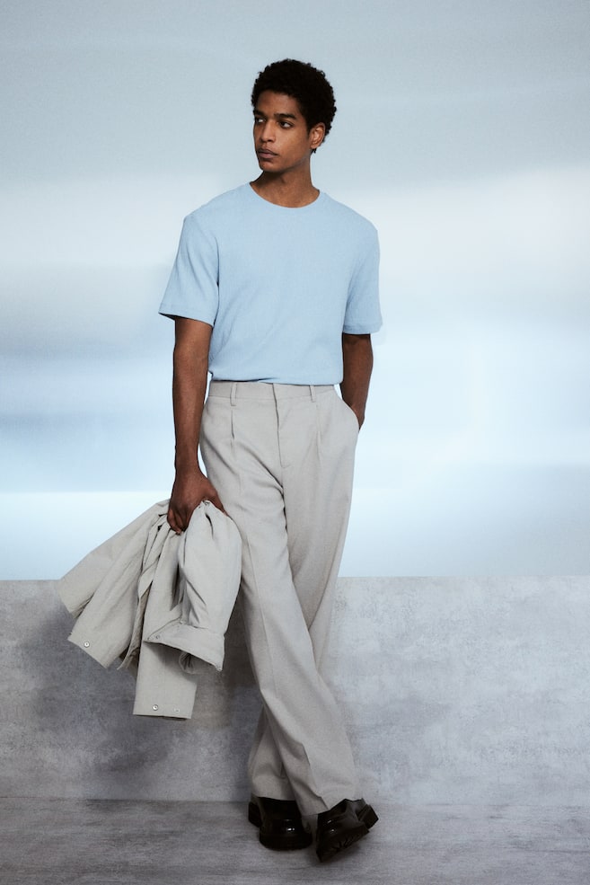 Футболка из структурированного трикотажа средней плотности из смеси хлопка. Модель с круглым вырезом и прямым подолом. Обычная посадка для комфортного ношения и классического силуэта.