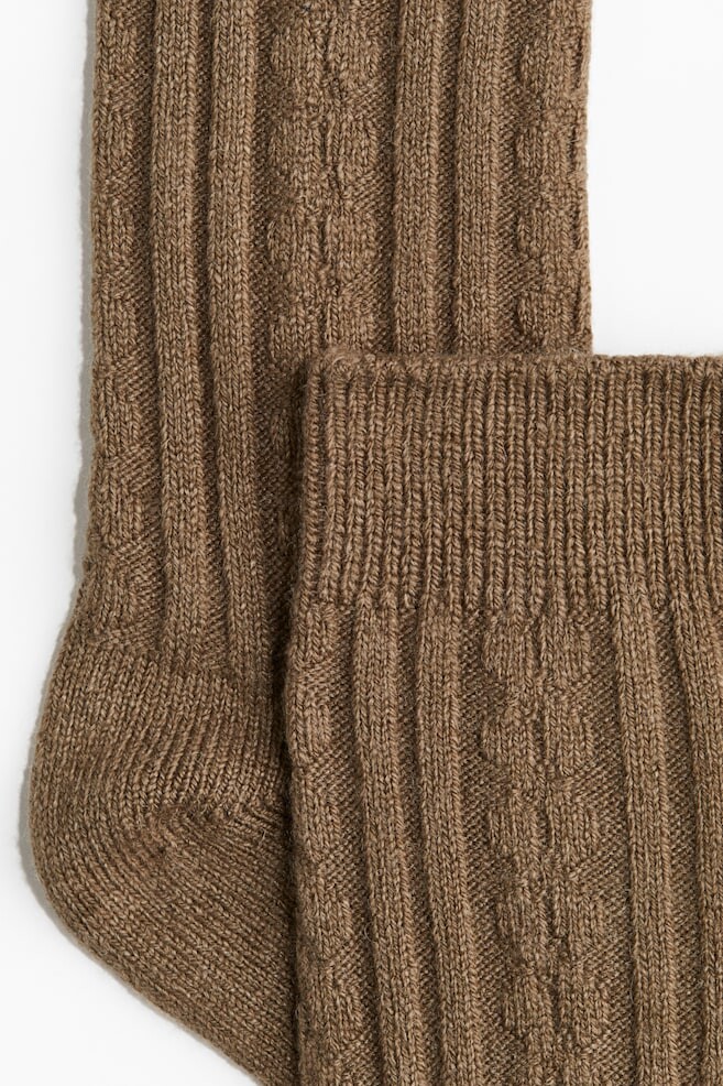 Носки с ребристым узором и косичной вязкой, с добавлением шерсти. Эластичные манжеты.