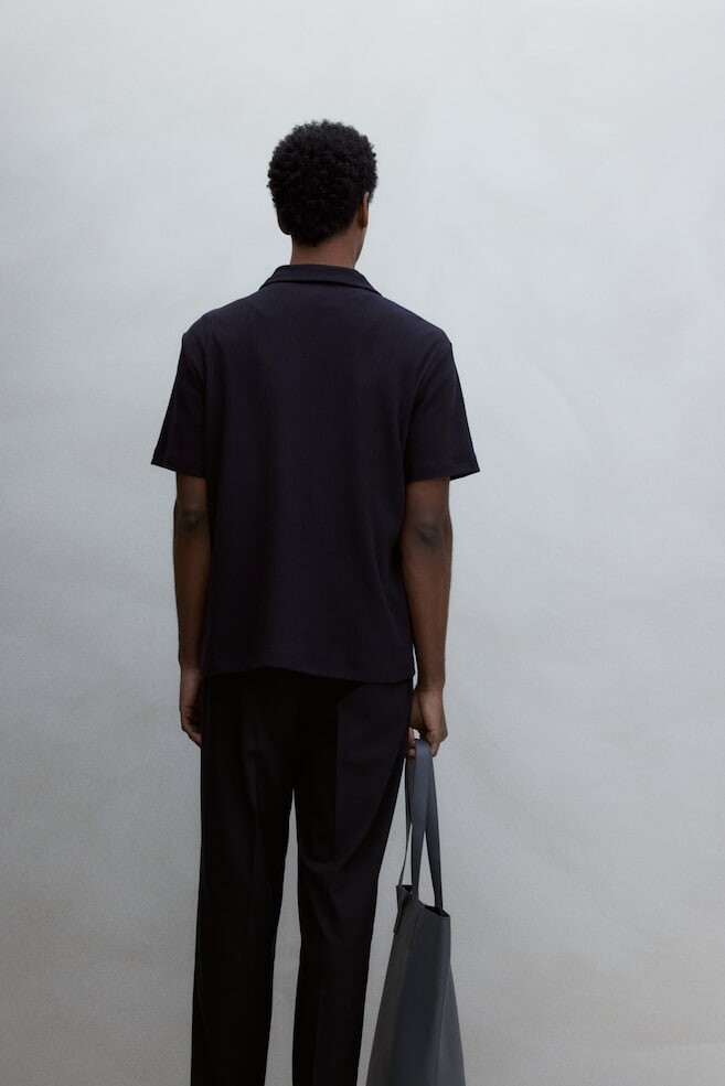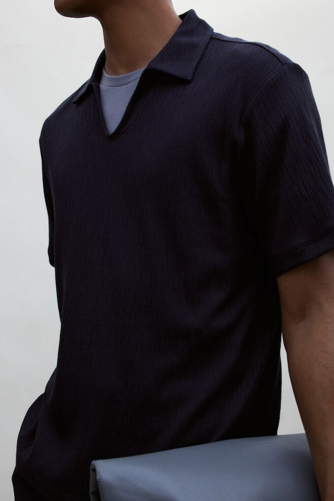 Футболка из структурированной хлопковой смеси. С воротником и небольшим V-образным вырезом спереди. Нормальный крой для комфортного ношения и классического силуэта.