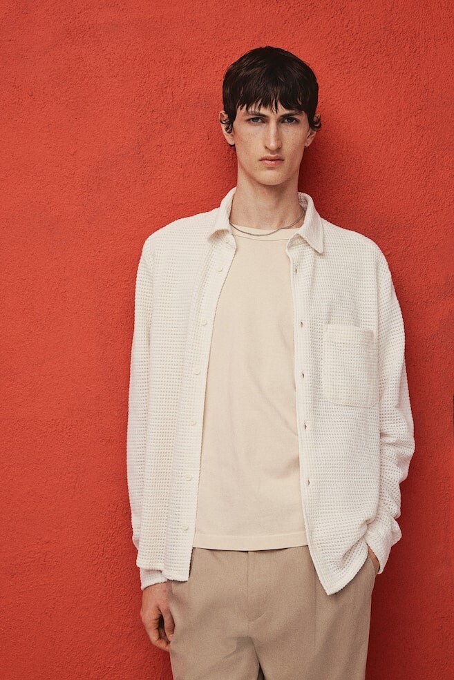 Рубашка из вафельного джерси с отложным воротником, французской застежкой на пуговицы, кокеткой сзади и открытым нагрудным карманом. Длинные рукава с манжетами на пуговицах и разрезом на рукаве. Прямой подол. Обычная посадка для удобной посадки и классического силуэта.