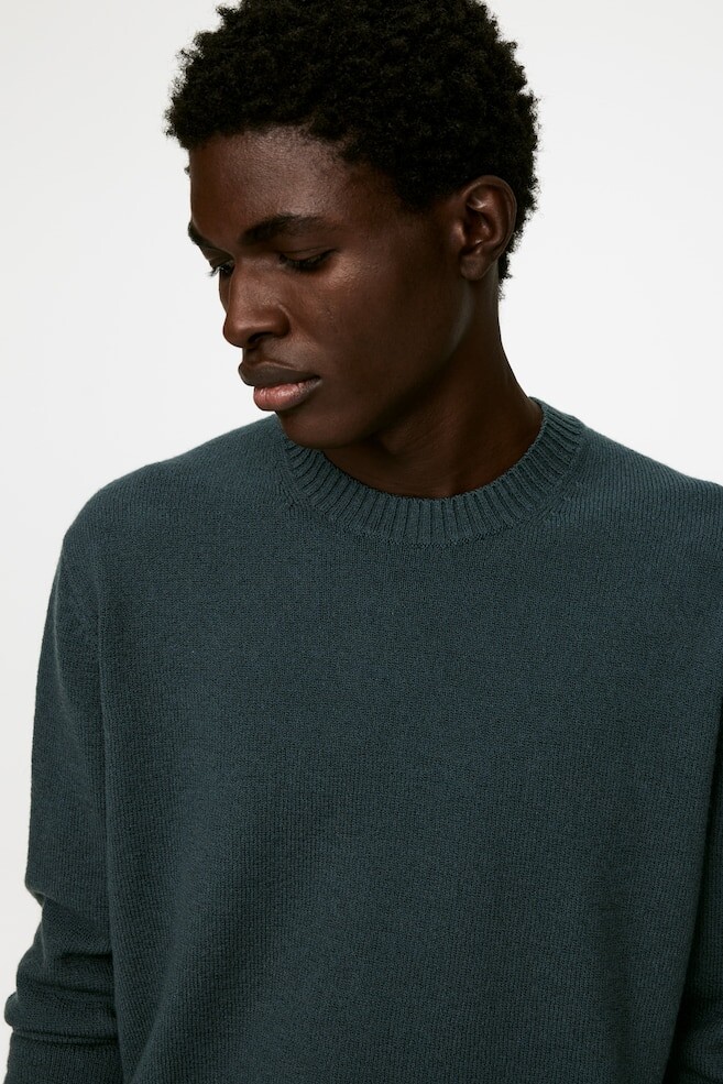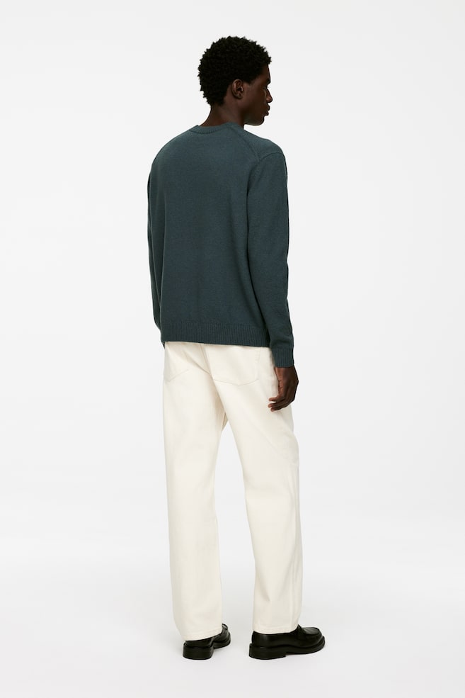 Вязаный свитер с круглым вырезом, выполненный лицевой гладью из пряжи из смеси шерсти и хлопка с неравномерной структурой. Ребристые манжеты. Обычная посадка. Модель изготовлена из 60% шерсти, сертифицированной RWS (TE-00047206). Продукция, сертифицированная по стандарту Responsible Wool Standard (RWS), содержит шерстяные волокна с ферм, которые прошли независимую сертификацию на соответствие требованиям по защите животных и управлению земельными ресурсами.