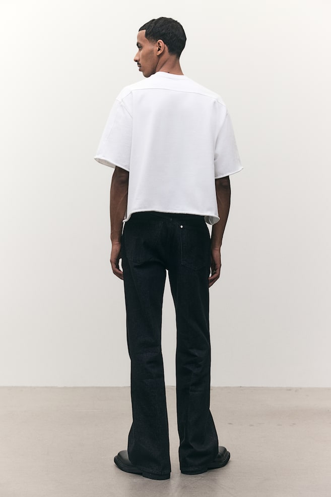 Свободная футболка из плотного хлопкового трикотажа с ребристым круглым вырезом, кокеткой сзади, спущенными плечами и необработанными подвернутыми краями. Свободный крой для особенно повседневного мешковатого стиля.