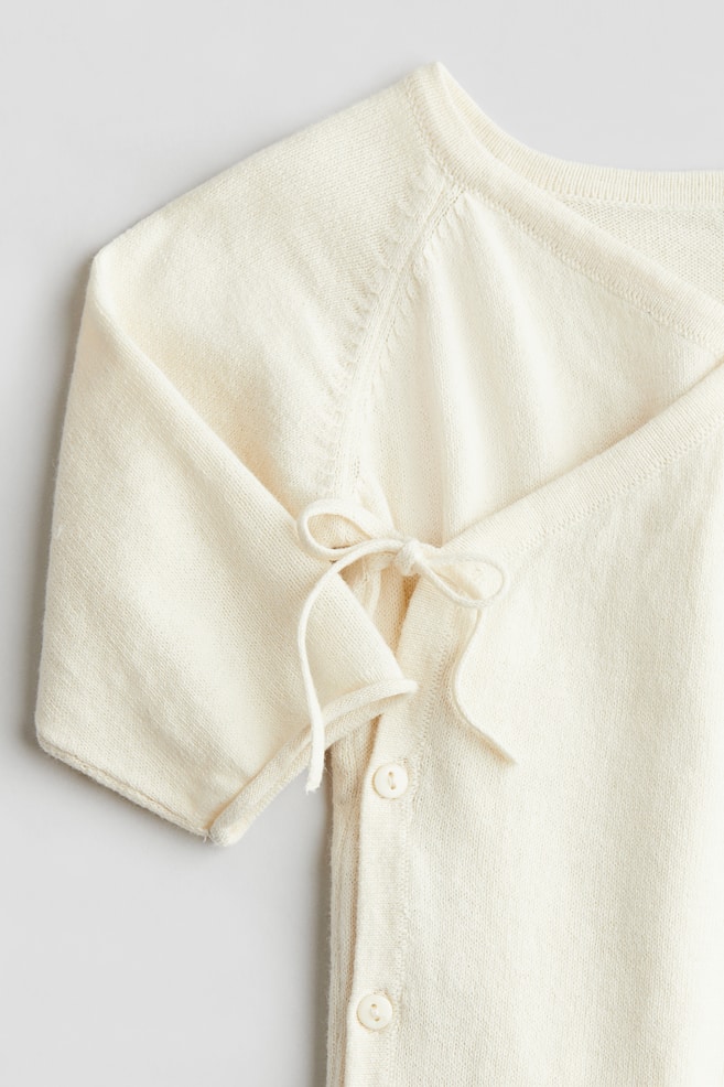 Комбинезон-обертка из мягкого тонкого хлопкового трикотажа. С V-образным вырезом, узкими завязками по бокам и длинными рукавами с подвернутыми краями. Видимые кнопки с одной стороны и скрытые кнопки с другой. Длинные штанины со ступнями.