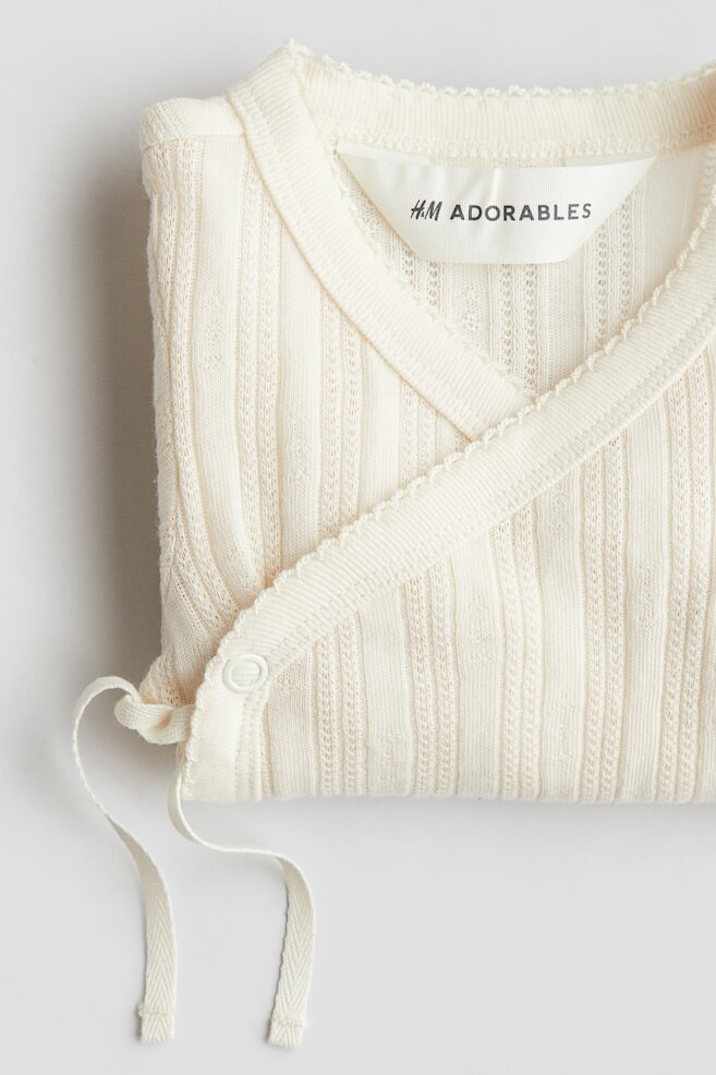 H&M Adorables. Боди с длинными рукавами из мягкого хлопкового трикотажа с ажурной отделкой и изящной отделкой пико. Запах спереди, завязки и кнопки с одной стороны, а также два ряда кнопок снизу для регулировки длины. H&M Adorables — это тщательно отобранная коллекция классических и удобных предметов одежды высокого качества.
