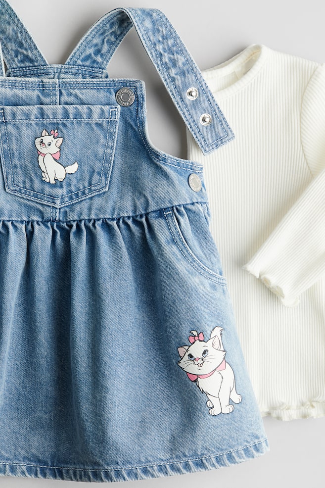 Комплект из платья-комбинезона из принтованного хлопкового денима и рубашки с длинными рукавами из мягкого ребристого хлопкового трикотажа. Платье-комбинезон имеет регулируемые бретели спереди, кнопки по бокам, открытый нагрудный карман и ложные боковые карманы. Разделительный шов со сборкой и слегка расклешенная юбка. Рубашка также имеет круглый вырез, застегивающийся на пуговицы разрез на горловине и оверлочные края на манжетах и подоле.
