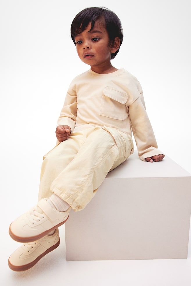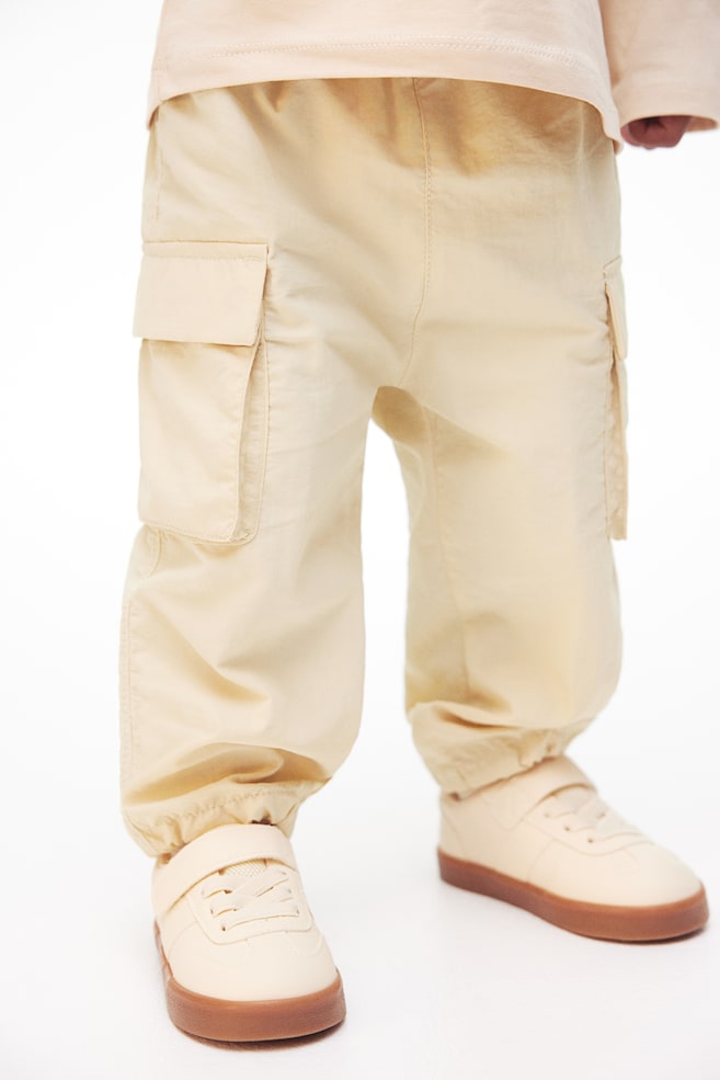 Спортивные брюки из мягкого нейлона с эластичным поясом, карманами-книжками с клапанами на штанинах и резинкой на концах штанин.