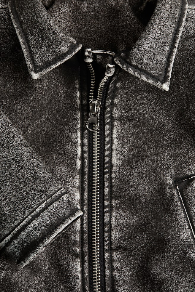 Куртка из ткани с покрытием, имеющей потертый вид. С отложным воротником, застежкой-молнией спереди с защитой подбородка и боковыми прорезными карманами. Заниженная линия плеча и длинные рукава. На подкладке.