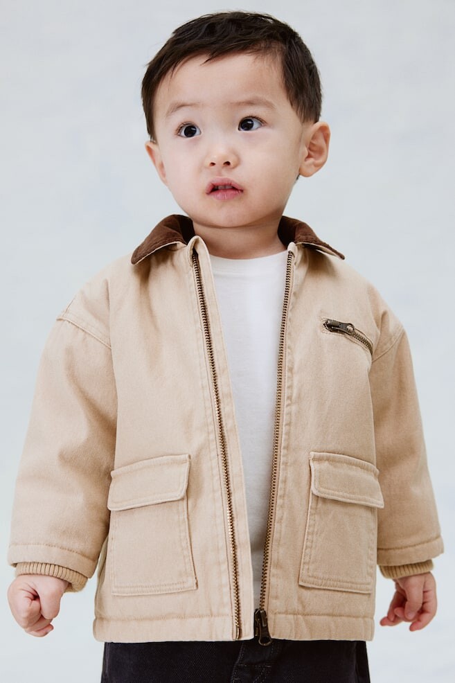 H&M Adorables. Слегка утепленная куртка из высококачественного хлопкового полотна с контрастным вельветовым воротником. Застежка-молния спереди с защитой подбородка, один нагрудный карман на молнии и передние карманы с клапаном. Заниженная линия плеч и ребристые внутренние манжеты. стеганая подкладка. H&M Adorables — это тщательно отобранная коллекция классических и удобных вещей высокого качества.