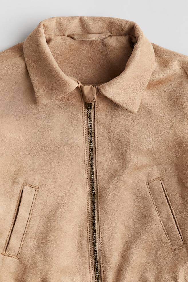 Куртка из начесаного материала с воротником, спущенными плечами и застежкой-молнией спереди с защитой подбородка. Прорезные карманы спереди и скрытая резинка на манжетах и подоле. На подкладке.