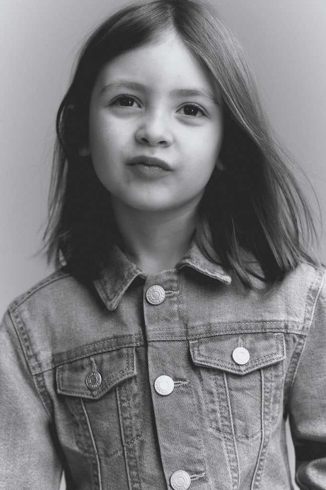 Джинсовая куртка с воротником на кнопках и нагрудными карманами с клапаном на кнопках. Длинные рукава с кнопками на манжетах и расклешенным подолом.
