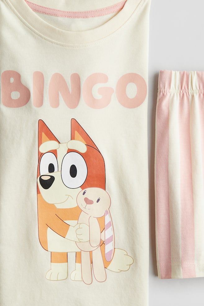Пижама из хлопкового трикотажа с принтом. Футболка с ребристым круглым вырезом и спущенными плечами. Подходящие шорты с эластичным поясом.