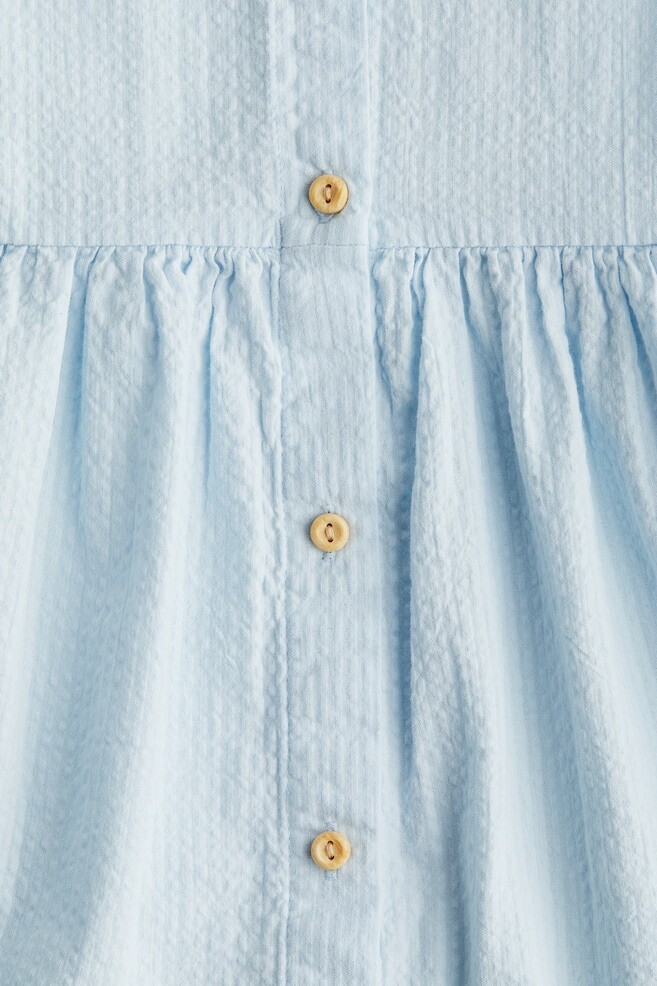 Платье без рукавов из мягкой хлопковой ткани. Лиф с настоящими пуговицами спереди и декоративной планкой с пуговицами на юбке. Присборено на талии, юбка расклешенная. Без подкладки.