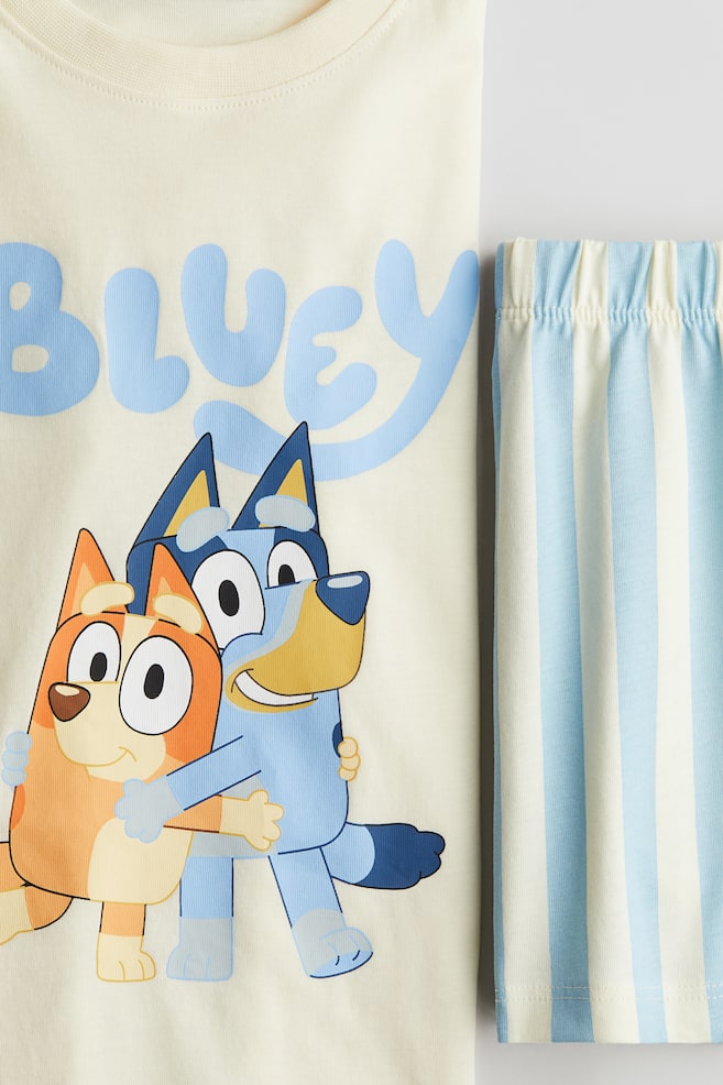 Пижама из хлопкового трикотажа с принтом. Футболка с ребристым круглым вырезом и спущенными плечами. Подходящие шорты с эластичным поясом.