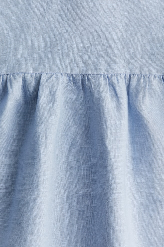 H&M Adorables. Расклешенное платье из мягкого, воздушного льна, идеально подходит для теплых летних дней. Круглый вырез, разрез на шее с пуговицами корозо и присборенная, высоко посаженная юбка. Короткие рукава с оборкой. Частично выровнен. Лен — это очень практичная ткань с легкой текстурой, которая быстро сохнет и со временем становится мягче. H&M Adorables — это тщательно отобранная коллекция классических и удобных вещей высокого качества.