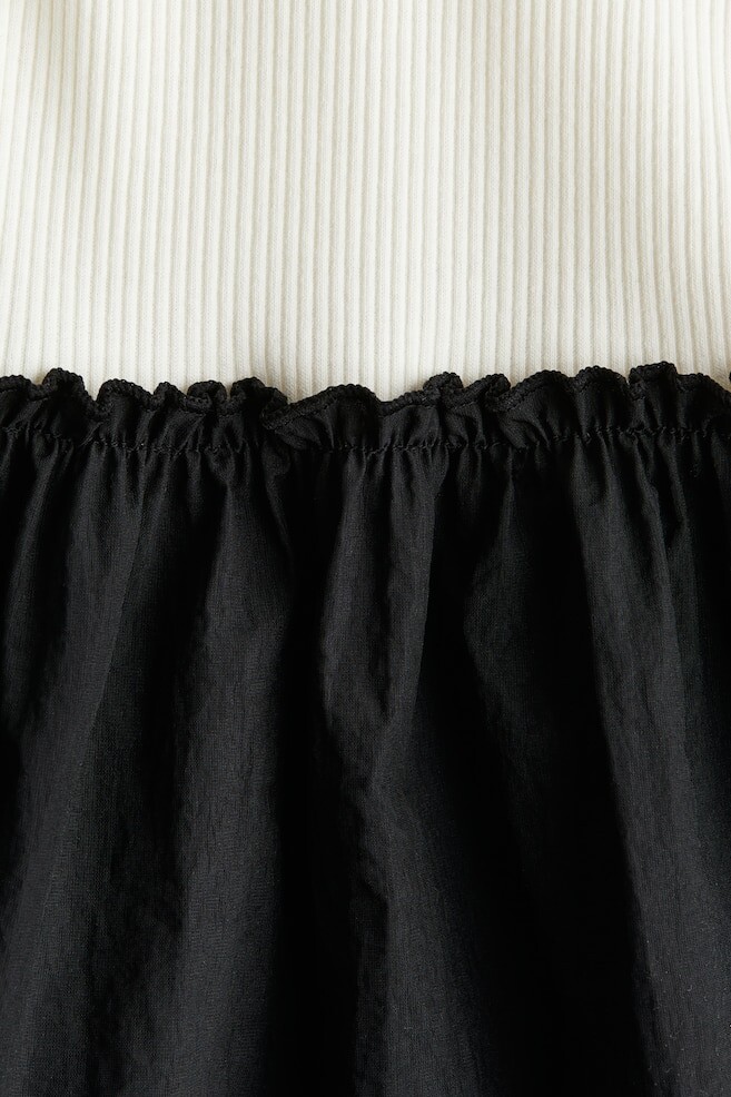 Платье с длинными рукавами из мягкого хлопкового трикотажа в рубчик и нейлоновой юбкой. Воротник «Питер Пэн» с контрастной окантовкой и вырезом-замочной скважиной с застежкой-пуговицей на шее. Расклешенная юбка с оборкой сверху. Без подкладки.