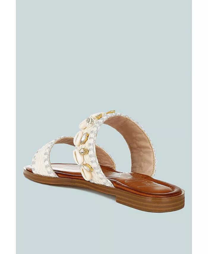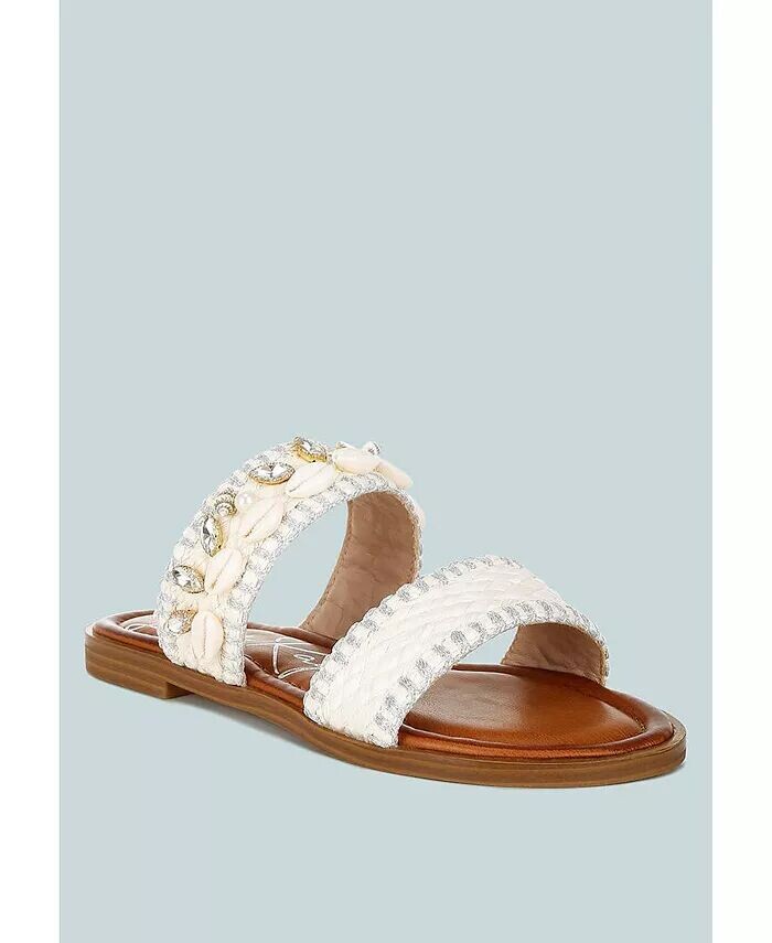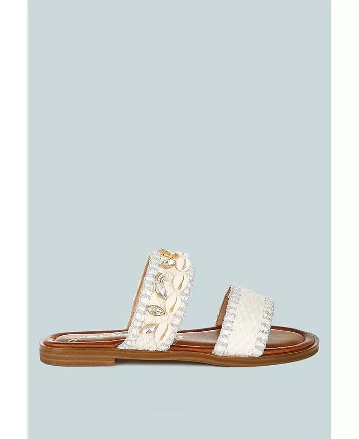 Откройте для себя идеальное сочетание стиля и комфорта с этими изысканными сандалиями из рафии. С плетеным союзом из рафии и элегантными металлическими деталями, они украшены потрясающими украшениями из ракушек, жемчуга и страз для нотки изысканности.