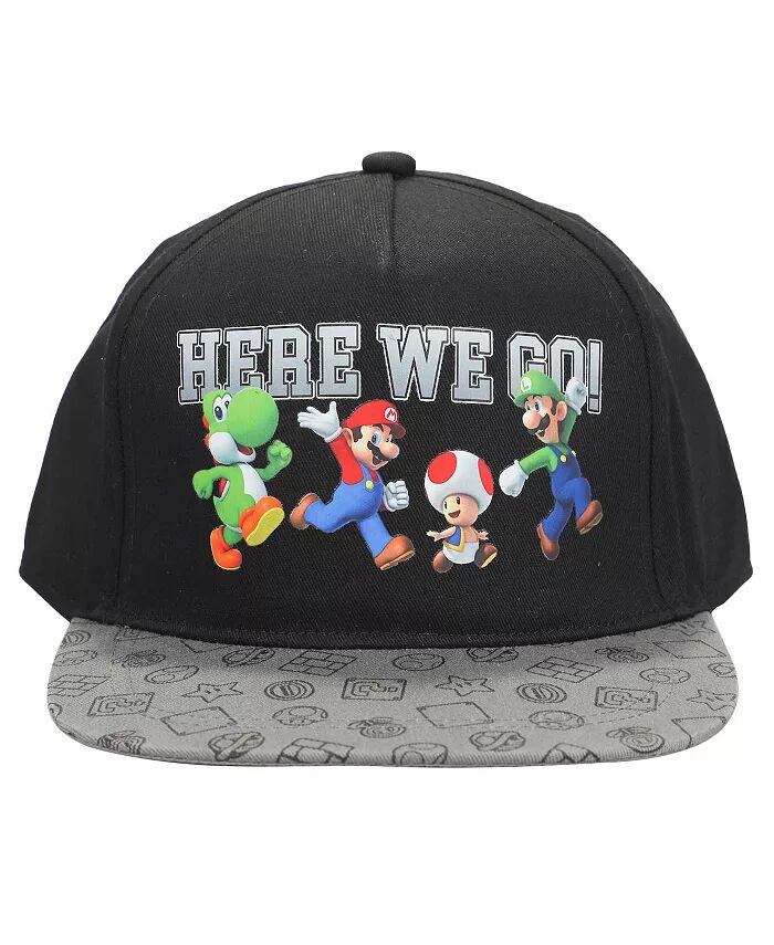 Почувствуйте стиль с этой бейсболкой Super Mario Bros. Кепка выполнена в черном цвете и украшена изображением бегущих Йоши, Марио, Тоада и Луиджи под серыми буквами, которые составляют «Here We Go». Изображения бонусов игры украшают плоский серый козырек.
