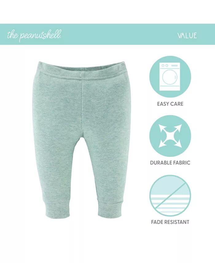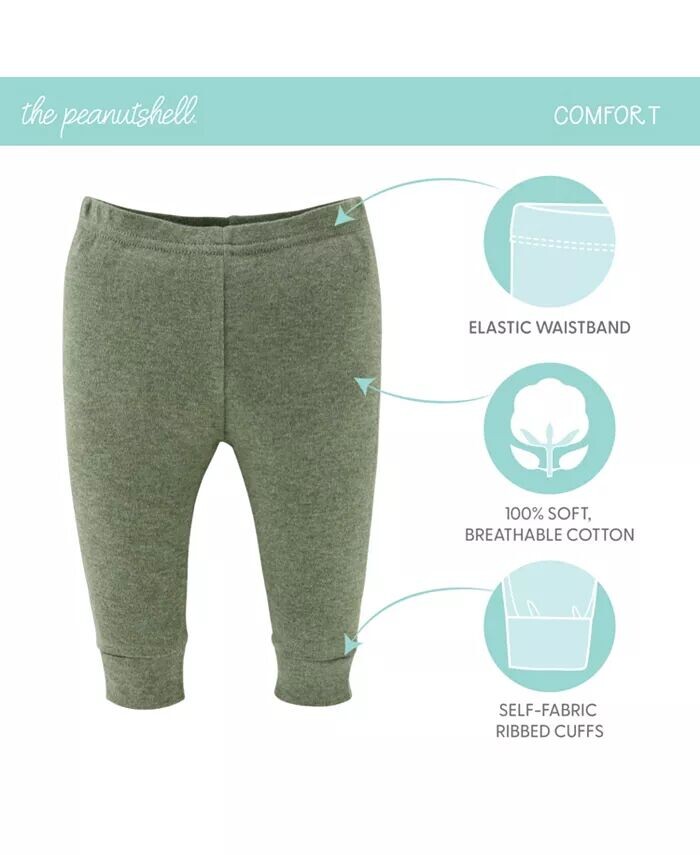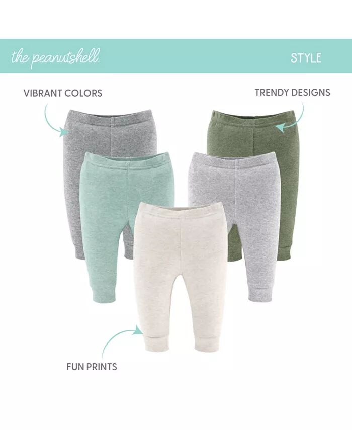 Комплект из 5 мягких брюк цвета нейтрали Peanutshell включает мягкие нейтральные цвета: зеленый, бирюзовый, серый, овсяный и черный. Изготовленные из 100% мягкого хлопка, эти успокаивающие брюки обеспечивают комфорт на весь день, а эластичный пояс и ребристые манжеты гарантируют, что они останутся на месте.