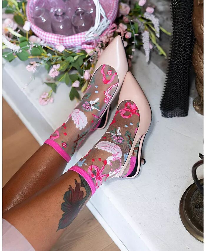 Наши прозрачные носки Balletcore - это воплощение детских фантазий о балерине, с лебедями, бантами и цветами в розовой цветовой палитре. Два лебедя стратегически размещены на внешней стороне лодыжки, а ленточное сердце - на внутренней стороне лодыжки. Нежные всплески зеленого и синего добавляют неожиданный штрих к этому женственному узору.
