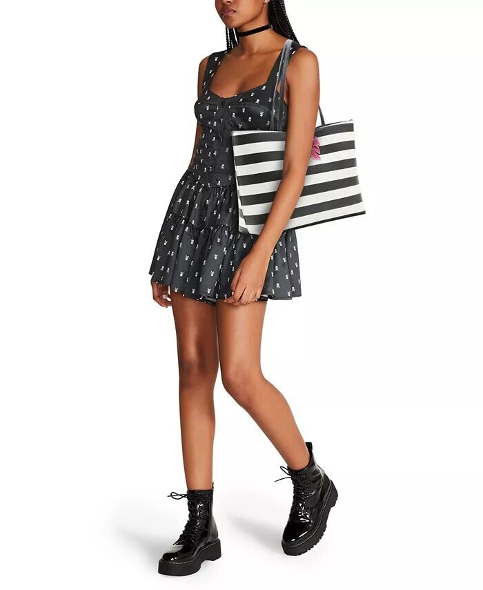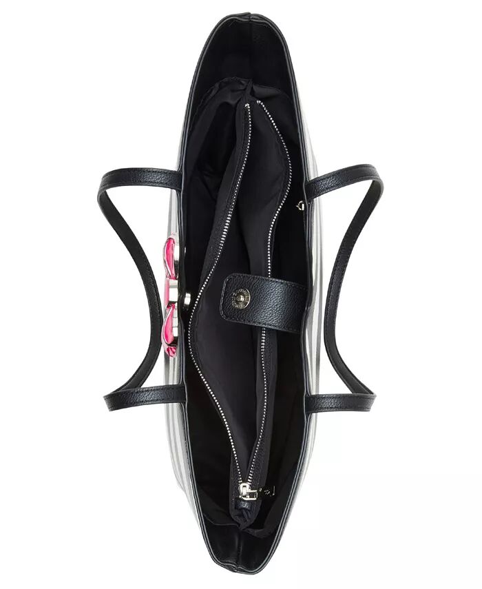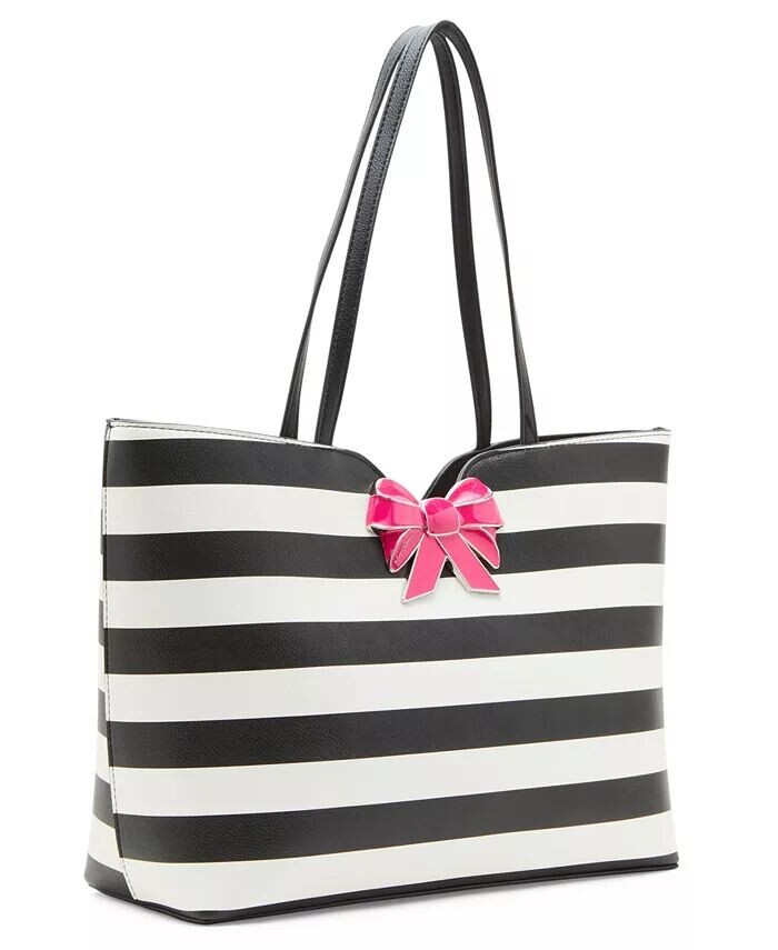 Эта новая полосатая сумка Betsey Johnson - это обновление нашей классической большой сумки. Она имеет большой эмалированный розовый бант, контрастирующий с черными и белыми полосками.