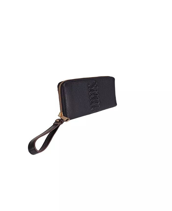 Этот кошелек сочетает в себе стиль и функциональность, подчеркнутые плетеными кожаными деталями спереди, а также такими особенностями, как ремешок для запястья или застежка-молния, внутренние отделения для карт или окошко для удостоверения личности, а также отделение для купюр и монет.