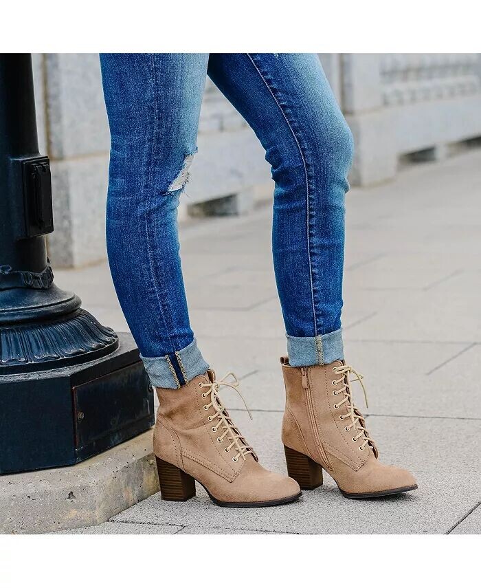 Наш взгляд на военные ботинки, Baylor by Journee Collection. Этот крутой стиль отличается мягким верхом из искусственной кожи, который поднимается выше щиколотки, и подчеркивается классической шнуровкой. Наборный блочный каблук, широкая стелька и мягкая стелька дополняют дизайн.