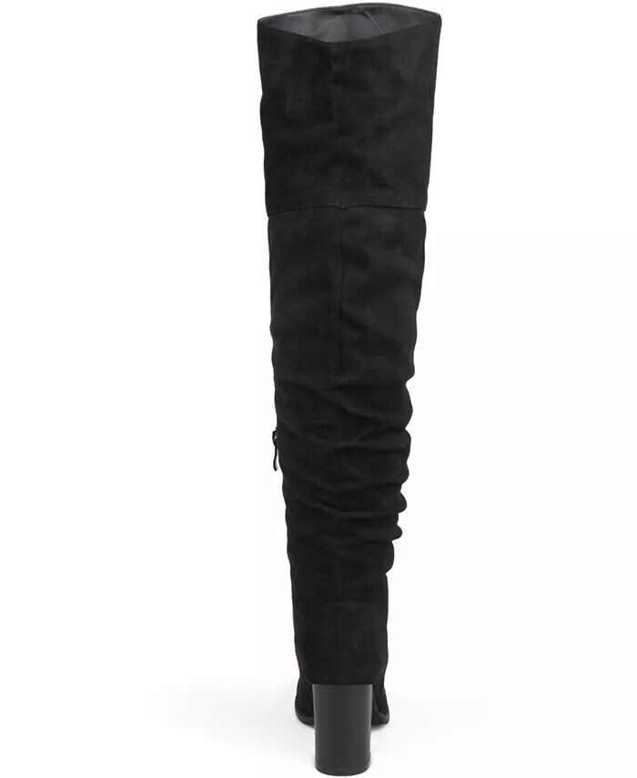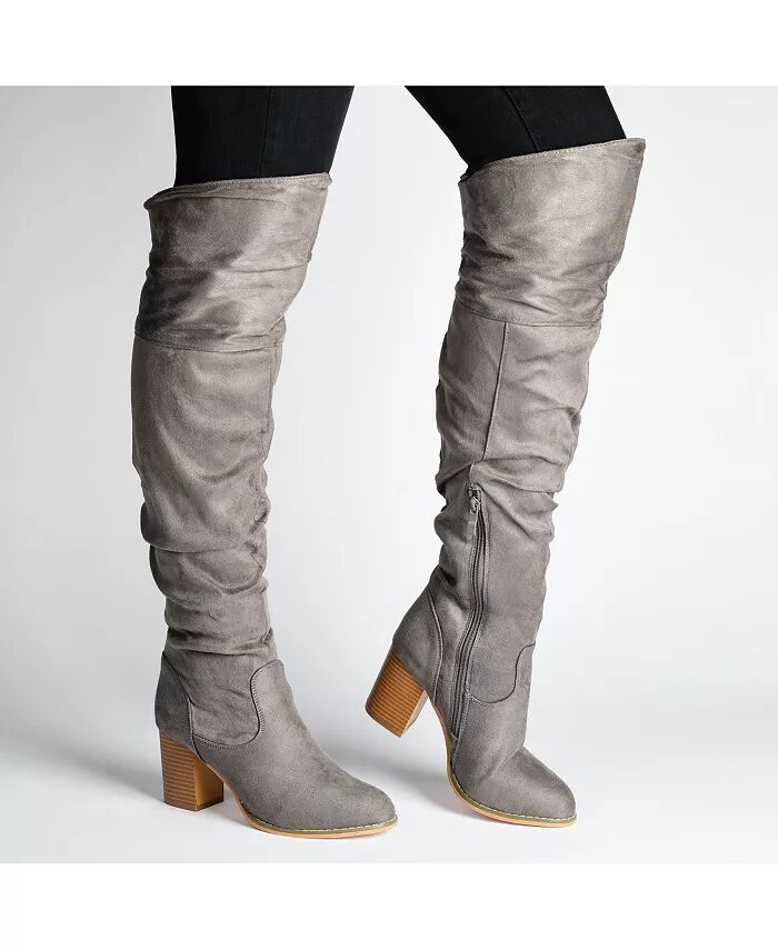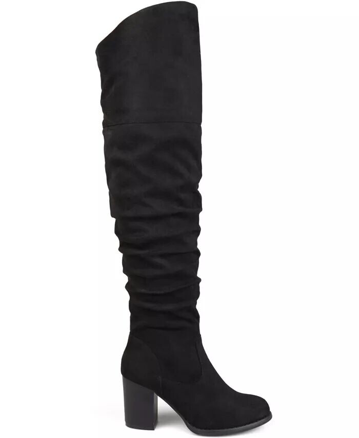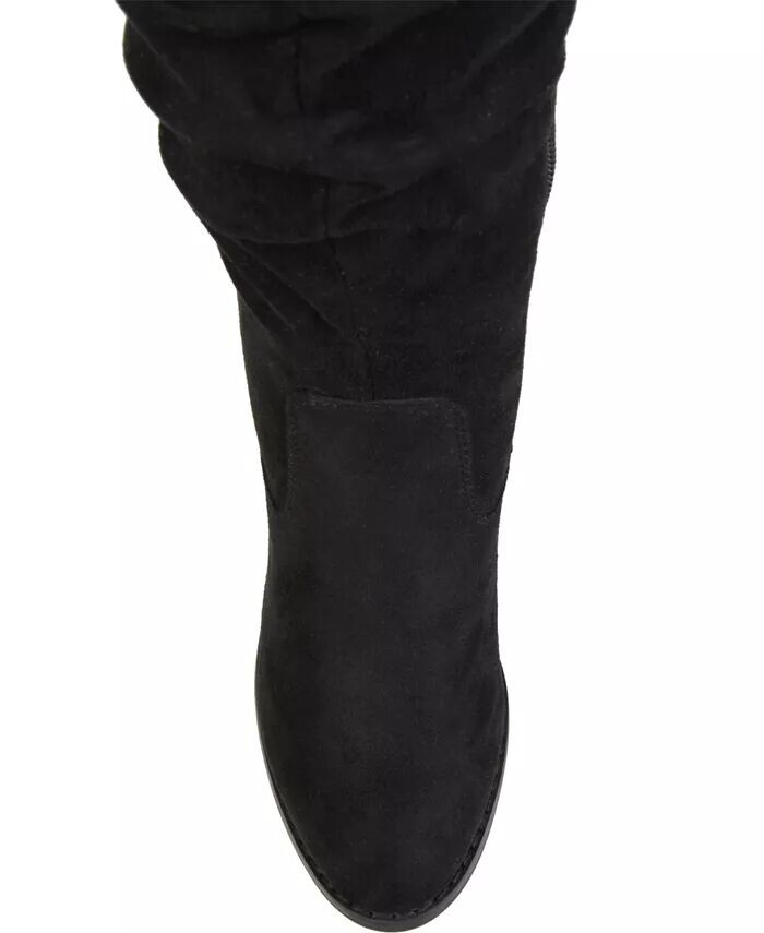 Сапоги выше колена с рюшами от Journee Collection сконструированы из мягкой искусственной замши (полиэстер, полиуретан), которая поднимается над коленями с приподнятыми союзками, которые создают стильную деталь. Закругленный носок и высокие массивные каблуки завершают дизайн