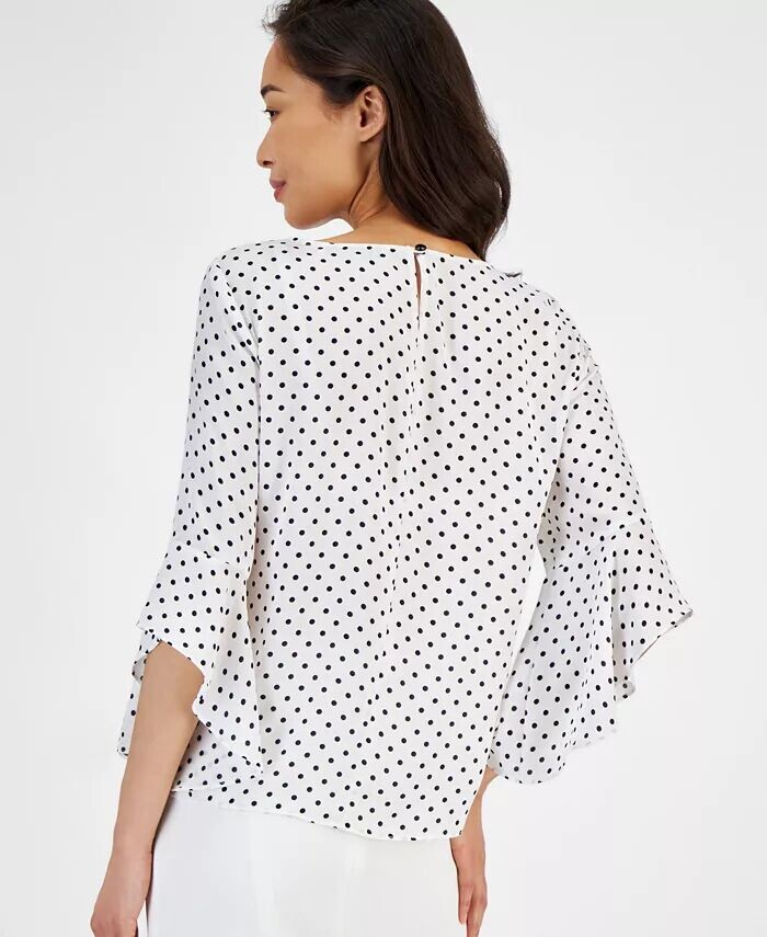 Добавьте нотку игривой элегантности в свой рабочий гардероб с помощью этого миниатюрного топа Kasper с принтом в горошек и оборками на рукавах, идеально сочетающего в себе классический шарм и современный стиль для создания шикарного офисного образа.
